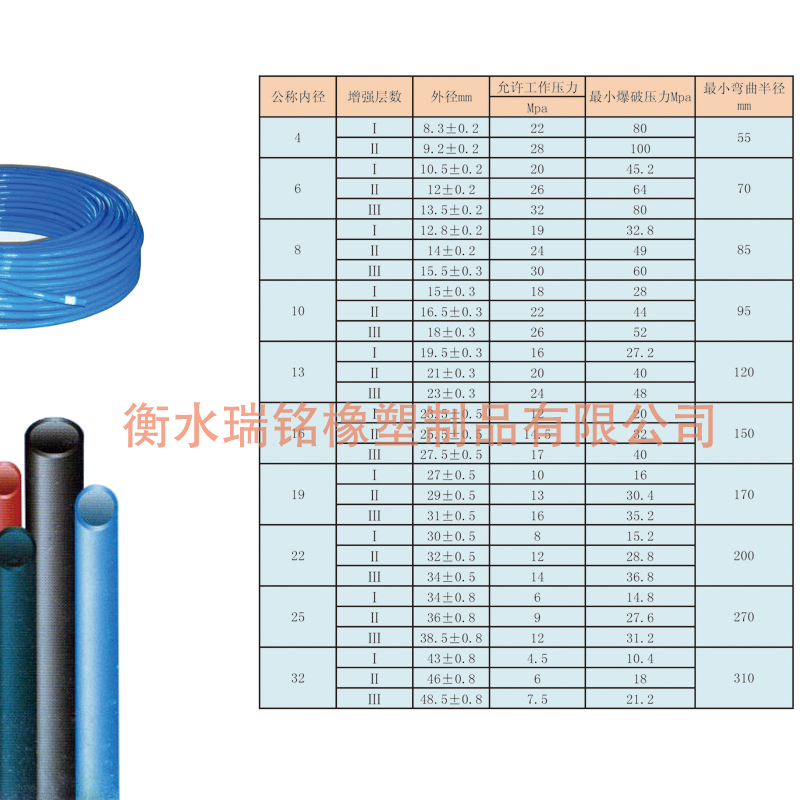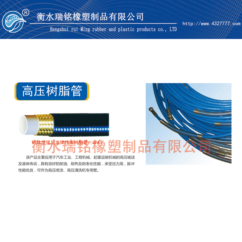產品主要用于汽車工業、工程機械、起重運輸機的高壓輸送及液體傳動,具有良好的耐油、耐熱及耐老化性能,承受壓力高,脈沖性能優良,可作為高壓噴漆專用管。