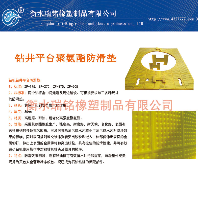 6、性能:采用聚氨酯橡膠生產,強度高,耐磨好,耐天候,老化好,表面有縱橫排列的多條排污凹槽,可及時排除油污或水污減小了油污或水污對防滑效果的影響,同時表面規則地交錯排列著突出膠粒和嵌入主體部份伸出表面的金屬鉚釘,伸出上表面的金屬鉚釘和突出膠粒,具有極佳的防滑性能,并可有效減少鉆機使用操作中對轉盤和鉆機鉆頭及器具的損壞。