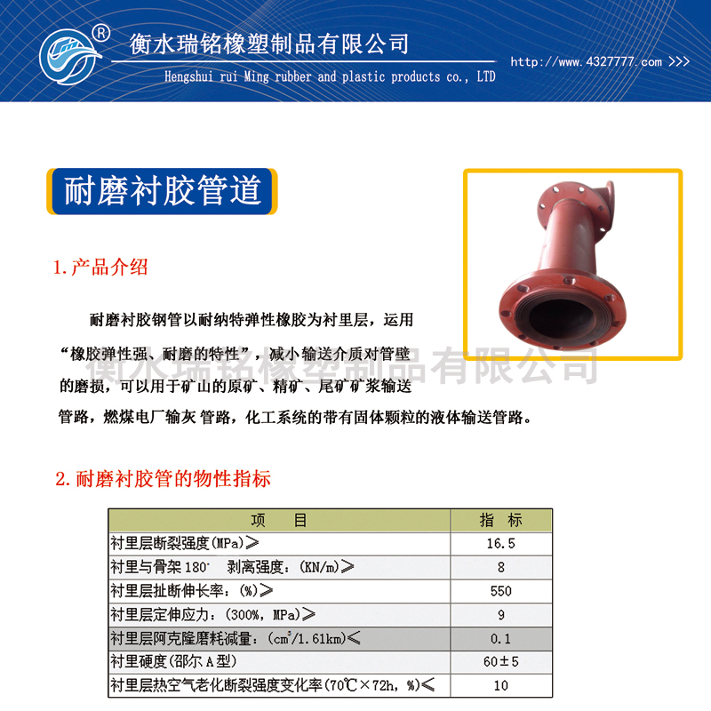 (1)耐磨襯膠管的物性指標: