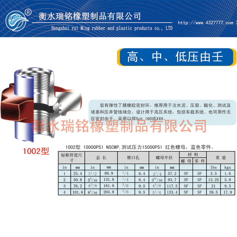 高度的互(hu)換(huan)性:所有由壬結構、聯接尺寸都可(ke)以(yi)與國際產品接口,全(quan)為英(ying)制尺寸;由壬密封圈完全(quan)可(ke)以(yi)同美國SPM、FMC公司產品互(hu)換(huan);翼形(xing)螺母上(shang)的規(gui)格、壓力等標記由模鍛一次成形(xing)。