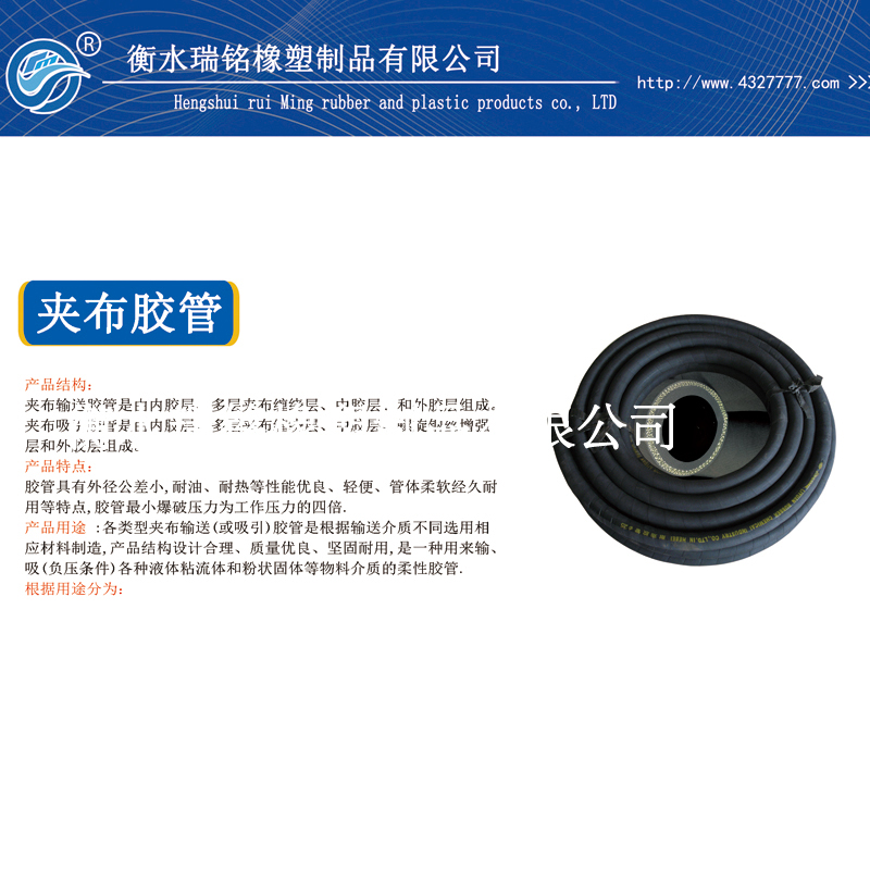 三、用(yong)途:各類型夾布膠管是(shi)根據輸送(song)介(jie)質(zhi)不(bu)同,選用相(xiang)應(ying)材料制造,產品結(jie)構 設(she)計合(he)理、質(zhi)量優良、堅固耐用(yong),是一種(zhong)(zhong)用(yong)來輸送(正壓條(tiao)件(jian))各種(zhong)(zhong)液體(ti)粘流體(ti)和粉(fen)狀固體(ti)等物料介質(zhi)的柔性膠(jiao) 管。