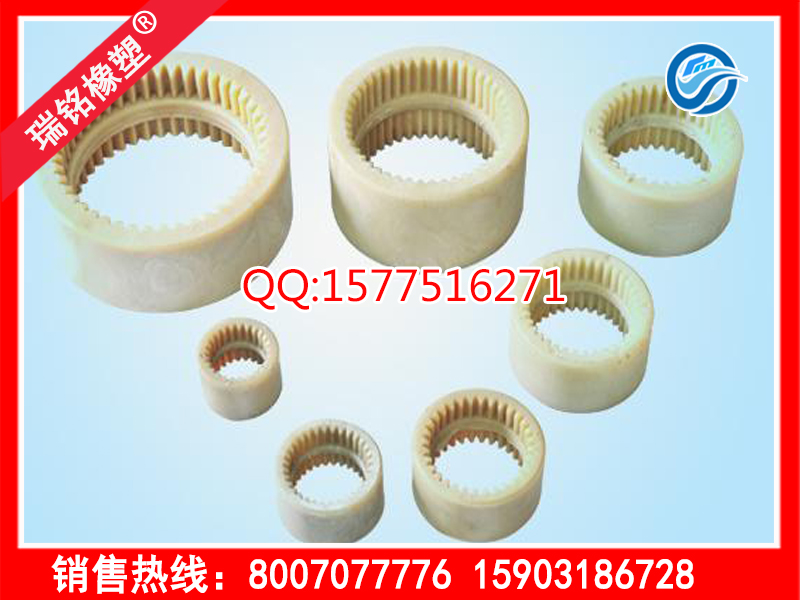 尼龍內齒圈是由帶外齒的凸緣半聯軸器和齒數相同的內齒圈等零件組成。外齒分為鼓形齒和直齒兩種齒形,所謂鼓形齒尼龍內齒圈即為將外齒制成球面,球面中心在齒輪軸線上,齒側間隙較一般齒輪大,鼓形齒尼龍內齒圈聯軸器可允許較大的角位移(相對于直齒聯軸器),可改善齒的接觸條件,提高傳遞轉矩的能力,延長使用壽命。