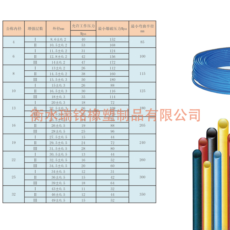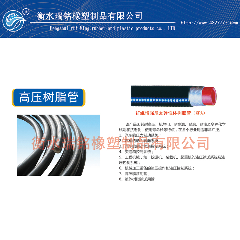 產品主要用于汽車工業、工程機械、起重運輸機的高壓輸送及液體傳動,具有良好的耐油、耐熱及耐老化性能,承受壓力高,脈沖性能優良,可作為高壓噴漆專用管。
