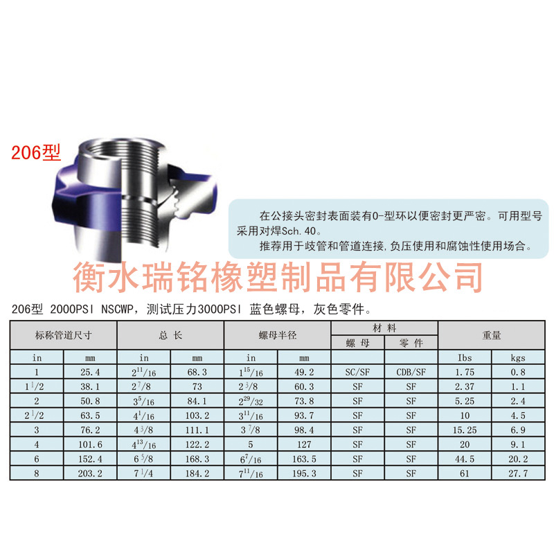 QS翼型由壬適用于標準工作環境和酸性工作環境,工作壓力從1,000 psi~15,000 psi,規格范圍從1″~8″;所有的由壬都有唯一的彩色標識以便于快速識別;材料滿足ASTM標準和AISI標準;可以和絕大多數由壬制造商的產品互換;適用于螺紋端頭、對接焊端頭和無壓力密封端頭聯結。