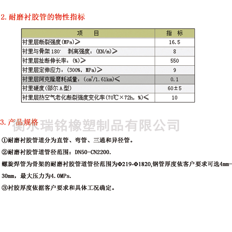 (1)耐磨襯膠管的物性指標: