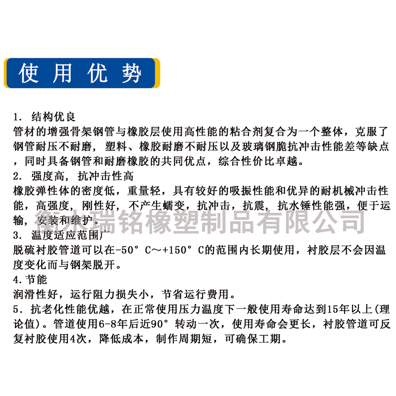 本產品柔韌性好,能適應各種地質情況,可直接彎曲鋪設;采用法蘭連接,無需襯墊片,連接快捷、簡便.