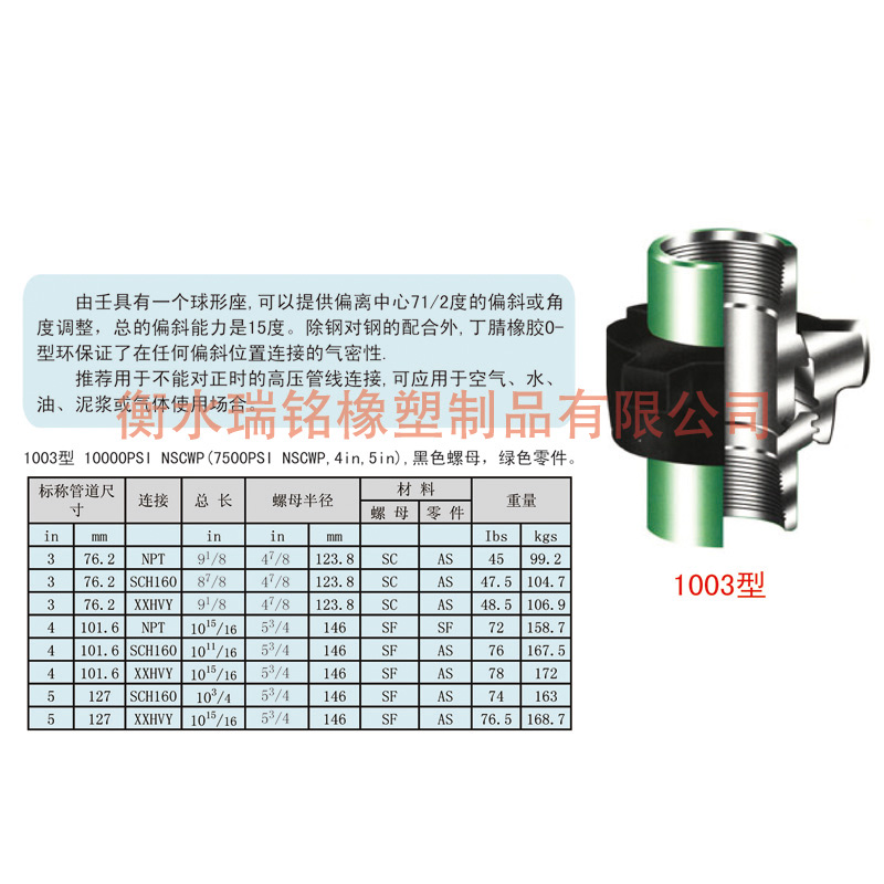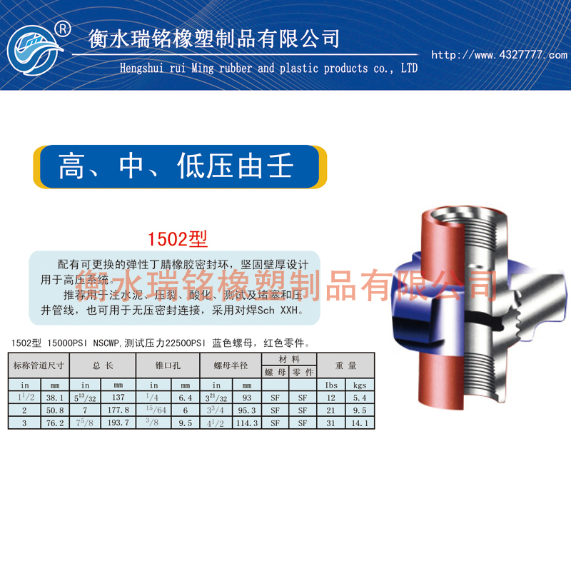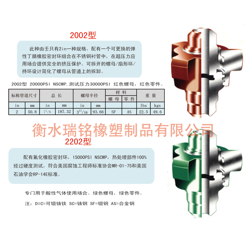 高度的互(hu)換(huan)性:所有由壬結構、聯接尺寸都可(ke)以(yi)與國際產品接口,全(quan)為英(ying)制尺寸;由壬密封圈完全(quan)可(ke)以(yi)同美國SPM、FMC公司產品互(hu)換(huan);翼形(xing)螺母上(shang)的規(gui)格、壓力等標記由模鍛一次成形(xing)。