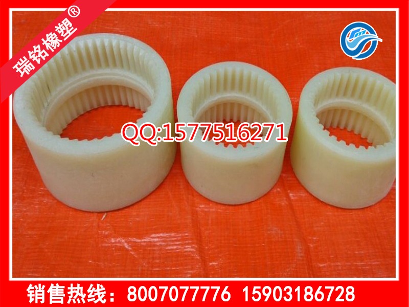 尼龍內齒圈是由帶外齒的凸緣半聯軸器和齒數相同的內齒圈等零件組成。外齒分為鼓形齒和直齒兩種齒形,所謂鼓形齒尼龍內齒圈即為將外齒制成球面,球面中心在齒輪軸線上,齒側間隙較一般齒輪大,鼓形齒尼龍內齒圈聯軸器可允許較大的角位移(相對于直齒聯軸器),可改善齒的接觸條件,提高傳遞轉矩的能力,延長使用壽命。