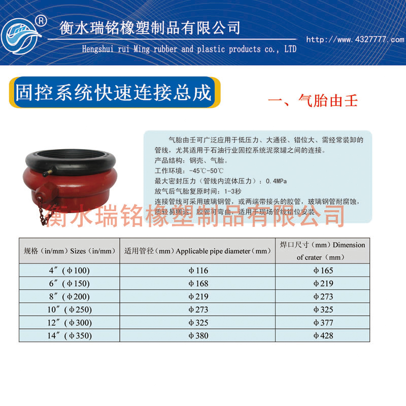 氣胎由壬,簡稱氣胎,又稱由壬氣胎,廣泛應用于低壓力、大通徑、錯位大、需經常裝卸的管線,尤其適用于石油行業固控系統泥漿罐之間的連接。連接管線可采用玻璃鋼管,或兩端帶接頭的膠管,玻璃鋼管耐腐蝕,質輕易搬運,膠管可彎曲,適用于現場管線錯位安裝。