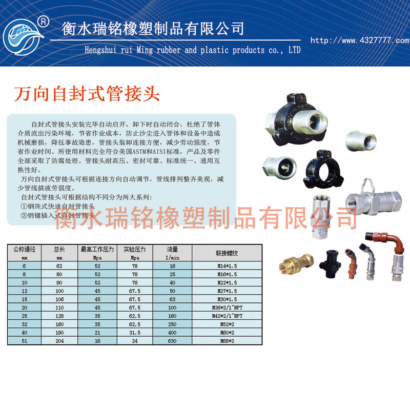 自封式管接頭安裝完畢自動啟開,卸下時自動閉合,杜絕了管體介質流出污染環境,節省作業成本,防止沙塵進入管體和設備中造成機械磨損,降底事故隱患,管接頭裝卸連接方便,減少勞動強度,節省作業時間。所使用材料完全符合美國ASTM和AISI標準,產品及零件全部采取了防腐處理。管接頭耐高壓、密封可靠、標準統一、通用互換性好。